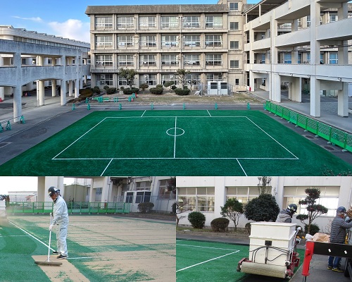 小学校ドッジボールコート人工芝張替工事(明石市) 小学校の敷地内にドッジボールコートの施工(張替え)